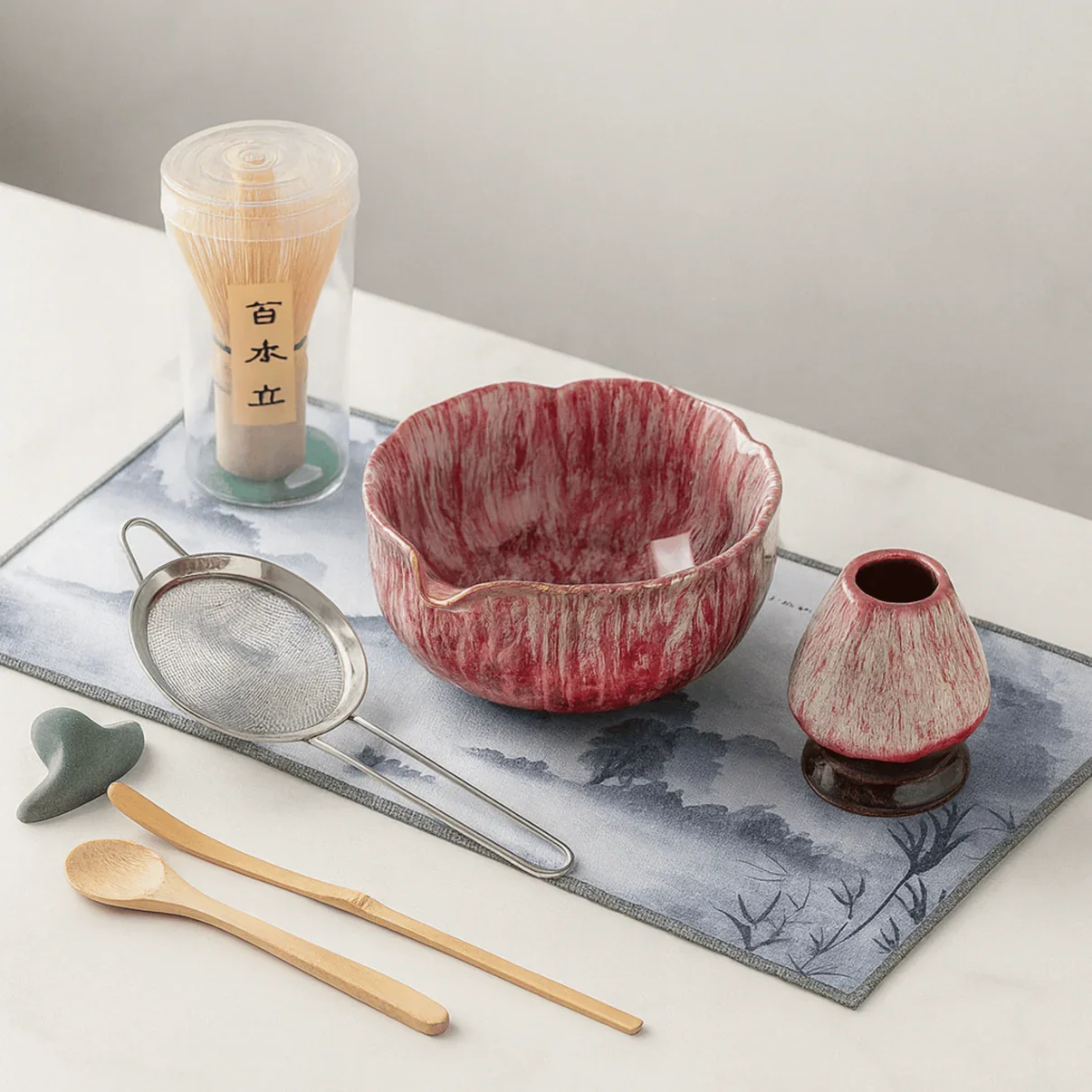This eight-piece handcrafted kiln-glazed ceremony kit includes all essential tools for traditional matcha preparation—from the spouted bowl to the finely carved bamboo whisk. Each piece features hand-painted enamel and metal accents that evoke refined Japanese artistry. This gift is perfect for tea lovers, collectors, and cultural enthusiasts.
