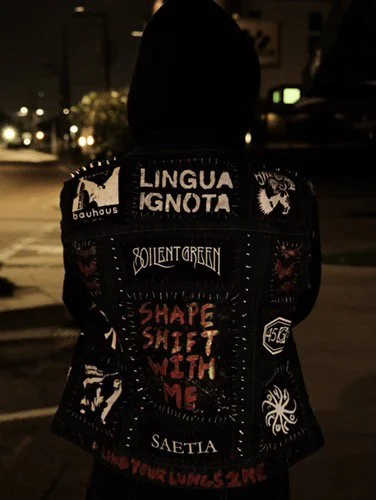 SL: I started to get really into this idea of one DIY fashion which is something I do a lot, especially with things like Battle fest. You know, how can I create my own clothes? How can I take older clothes and rejuvenate them? How do I create something that's my own? And then when I went to high school, that started to transition into, I got deeper into the punk scene, and I also started to get into goth, and that's where, kind of the melding, I guess, of my personal style, really started to emerge, was looking through a lot of those. For example, I have my battle vest has multiple patches that are sealed with clear nail polish, including my big back patch that says shape shift with me, and I used a glittery top coat for the sealant that the glitter changes colors in the light to red, but yeah you really have to use what you got. I take a lot of influence from people like Ethel Cain, Sasha Calle, Julien Baker, and Keshi.