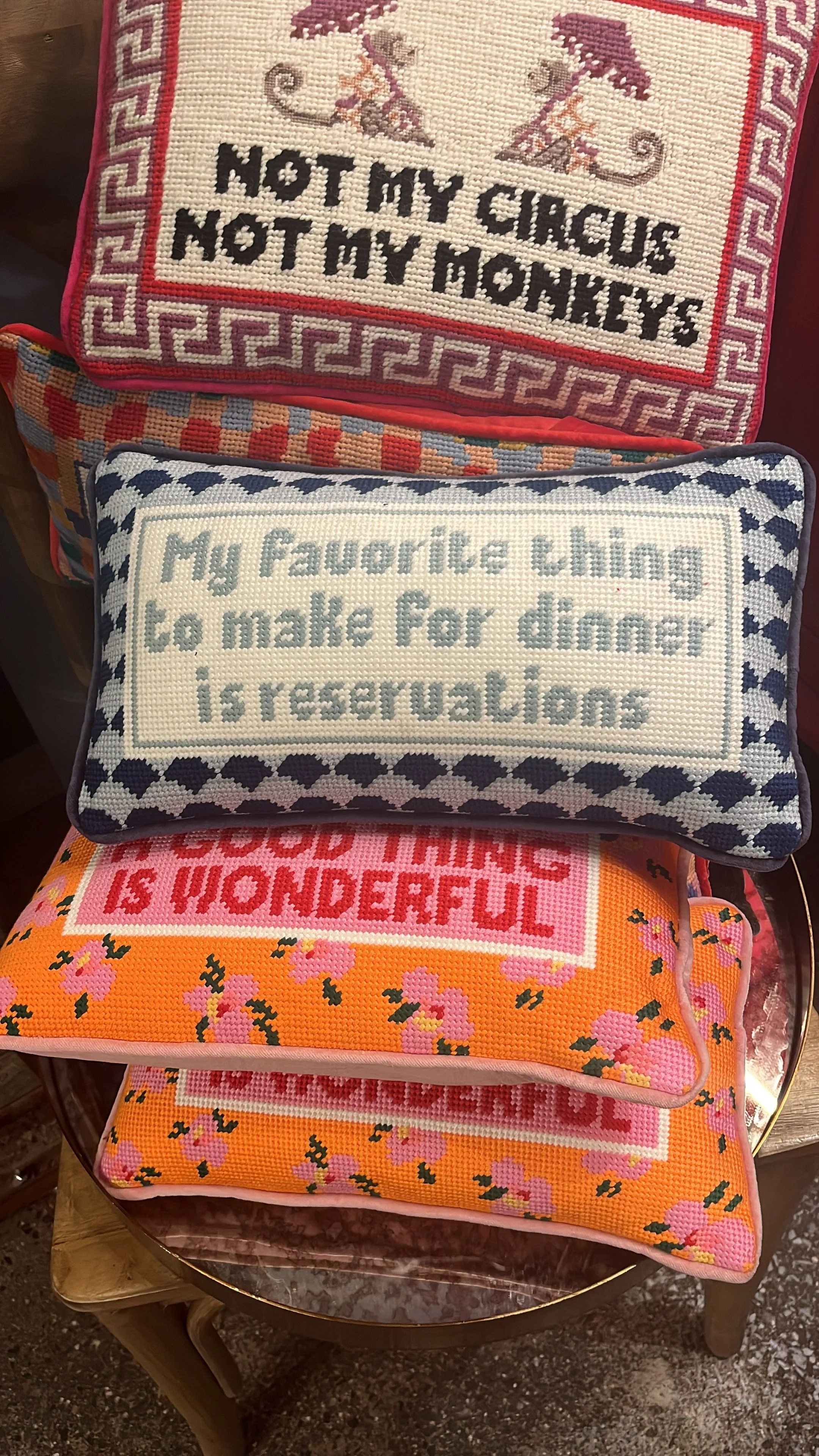 Needlepoint has become a way to marry old-world charm and modernism. The “grandmillennial” style is all about the juxtaposition of the old and the new. This generation’s needlepointers aren’t just recreating vintage needlepoint designs; they are stitching trending phrases, designer bags, or popular song lyrics. By blending centuries-old techniques with newer concepts, they are making pieces that feel both current and nostalgic.